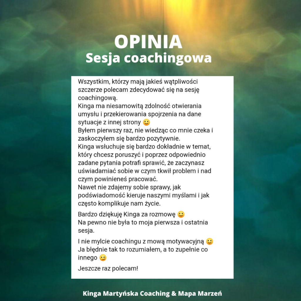 Towarzyszę w odkrywaniu sensu życia i realizacji marzeń transformując ograniczające przekonania oraz zmieniając punkt widzenia na to co wydawało się niemożliwe.