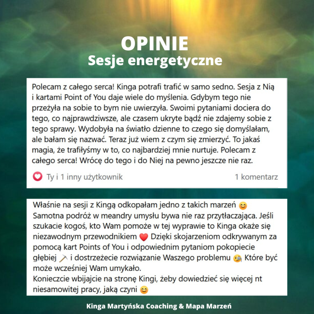 - Zadaję GŁĘBOKIE pytania, a ty odzyskujesz klarowność tego KIM JESTEŚ TERAZ oraz czego konkretnie chcesz w danym obszarze życie (relacje, miłość, praca, biznes, energia, zdrowie)